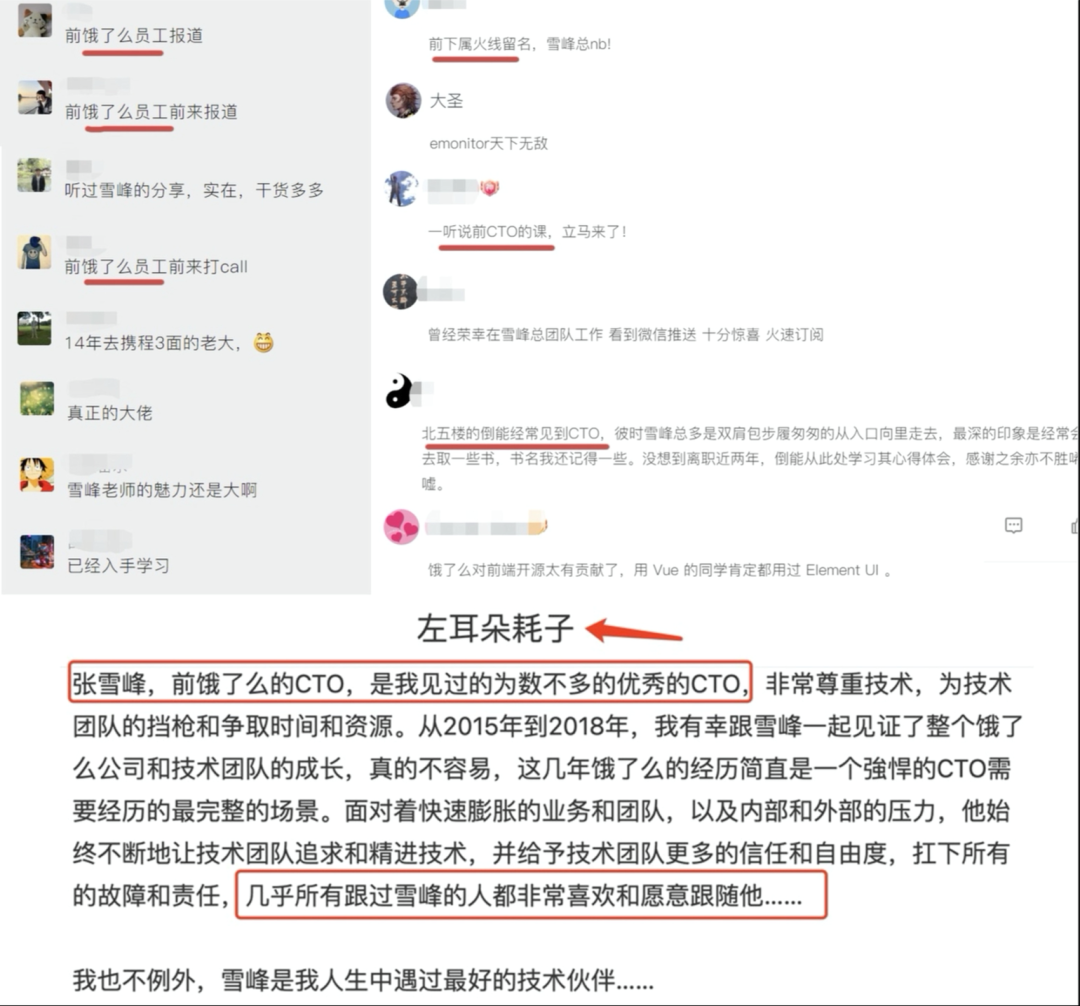 而且他也影响了很多人,在专栏《超级访谈:对话张雪峰》上线后,一直有或前或现役的饿了么员工“前来报道”,由此又印证了 雪峰大佬“虽远离江湖,但江湖仍有他的传说”这件事。我摘录了一些“追随者”的评价,时至今日我隔着屏幕都能感受到他们的“长情”: