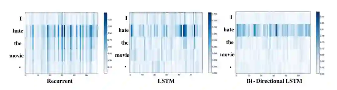这三种模型中"hate"都具最高的显著性分数,并削弱了其他token的影响。LSTM比标准的循环模型更清晰地关注"hate",双向LSTM的效果最为明显,除了"hate"之外的单词,其他单词几乎没有影响。这可能是由于LSTMs和Bi-LSTMs中的门结构机制控制了信息流,使得这些架构能够更好地过滤掉不太相关的信息。此外一阶导数显著性常用于神经网络模型,因为可以通过单独调用深度学习引擎提供的自动求导来计算得到。最近的工作还提出了对一阶导数显著性的改进[21]。如其名称和定义所述,一阶导数显著性可以实现特征重要性的可解释,特别是在token-level的特征。