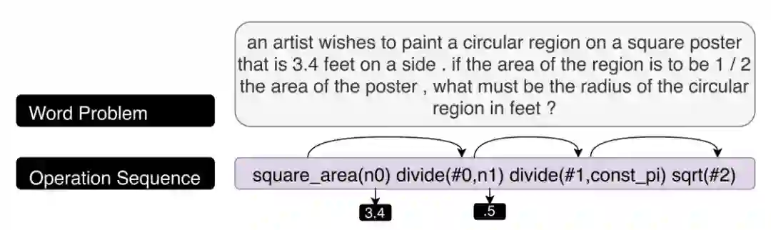 该方法通过模仿人类解决问题的过程设计神经网络架构,由于该架构包含模拟人类认知的组件,使得学习到的模型(部分)可解释。实现这样的模型架构可用于解决数学问题MathQA[18][20]或句子简化问题[24]。这种设计也可以应用于可解释的替代模型。以MathQA为例,在数学考试中,答题者经常被要求逐步给出答案是如何推导得到的,如果缺少推导中的任何关键步骤,那么答题者很大可能不能得到满分。MathQA模型利用可解释的结构设计试图重现这一推导过程。MathQA是一个大型英语多项选择数学问题的数据集,训练数据通过众包的方式进行标记。对于一个问题,参与标记者会被要求循环执行下面的步骤:首先选出一个操作(加、减、乘、除、平方等),然后从问题题干中或之前操作的计算结果中标记这个方法所需要的参数,直到获得的操作集合能够共同作用得出答案。在实际训练中希望获得的是一个encoder-decoder的结构,将输入的问题题干看作是编码后的数据,而目的是将其解码为一个以各种操作为元素的序列。通过这一序列,可以清楚的认识到整个求解过程。实例效果如下: