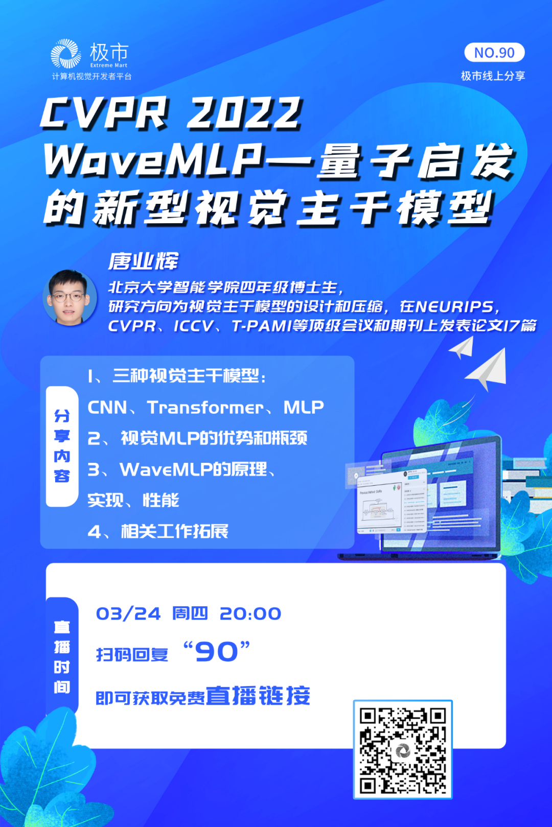 关注“极市平台”公众号,回复“90”或“唐业辉”可获取免费直播链接。