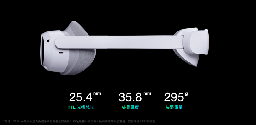 PICO 4的TTL(光机总长)只有25.4毫米,头显最薄的地方只有35.8毫米,非常轻盈小巧。