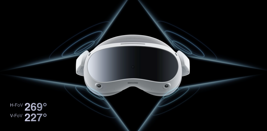在手柄定位性能提升上,PICO 4搭载了4颗环境追踪摄像头,它们位于头显外沿的斜切面上,使得头显的SLAM覆盖范围达到了269 x 227度的超广FOV,手柄追踪范围显著扩大。