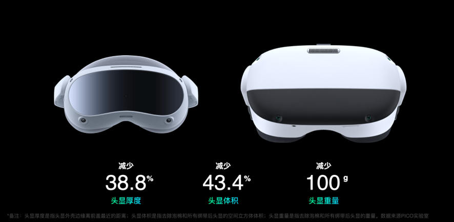 然而,本次发布的PICO 4采用的是前沿的Pancake光学方案,其相比于前代Neo 3,其头显厚度减少了接近40%、体积减少了43%。