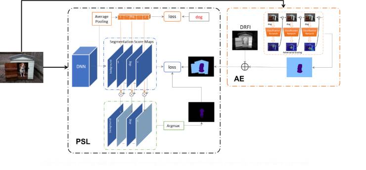 我们利用显著性检测技术生成的显著图生获取图像的背景信息,并同通过对抗擦除获得物体区域结合生成用于训练语义分割网络的segmentation mask(其中蓝色区域表示未指派语义标签的像素,这些像素点不参与训练)。由于在生成的segmentation mask中包含了一些噪声区域和未被标注的区域,为了更加有效地训练,我们提出了一种PSL(Prohibitive Segmentation Learning)方法训练语义分割网络,如图7。该方法引入了一个多标签分类的分支用于在线预测图像包含各个类别的概率值,这些概率被用来调整语义分割分支中每个像素属于各个类别的概率,并在线生成额外的segmentation mask作为监督信息。由于图像级的多标签分类往往具有较高的准确性,PSL方法可以利用分类信息来抑制分割图中的true negative区域。随着训练的进行,网络的语义分割能力也会越来越强,继而在线生成的segmentation mask的质量也会提升,从而提供更加准确的监督信息。