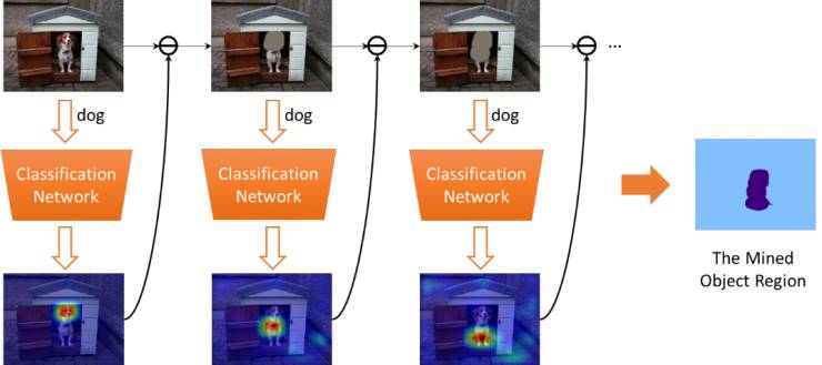 基于上述的motivation,我们采用了对抗擦除的机制挖掘物体的相关区域。如图4所示,我们首先利用原始图像训练一个分类网络,并利用自上而下的attention方法(CAM)来定位图像中最具判别力的物体区域。进而,我们将挖掘出的区域从原始图片中擦除,并将擦除后的图像训练另一个分类网络来定位其它的物体区域。我们重复此过程,直到网络在被擦除的训练图像上不能很好地收敛。最后将被擦除的区域合并起来作为挖掘出的物体区域。