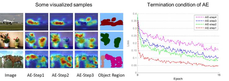 我们发现在实施第四次擦除后,网络训练收敛后的loss值会有较大提升(图6右)。主要原因在于大部分图片中的物体的区域已经被擦除,这种情况下大量的背景区域也有可能被引入。因此我们只合并了前三次擦除的区域作为图片中的物体区域。图6左给出部分训练图像在不同训练阶段挖掘出的物体区域,以及最后将擦除区域合并后的输出。