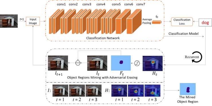 图3给出了我们的motivation。我们将第一张图片以及它对应的标签“person”输入到网络中进行训练。继而,网络会尝试从图中发现一些证据来证明图中包含了“person”。一般来讲,人的head是最具判别力的部位,可以使此图被正确地判别为“person”。若将head从图片中移除(如第二张图中的橙色区域),网络会继续寻找其它证据来使得图像可以被正确分类,进而找到人的body区域。重复此操作,人的foot区域也可以被发现。由于训练本身是为了从图片中发现对应标签的证据而擦除操作则是为了掩盖证据,因此我们称这种训练-擦除-再训练-再擦除的方式为对抗擦除(adversarial erasing)。