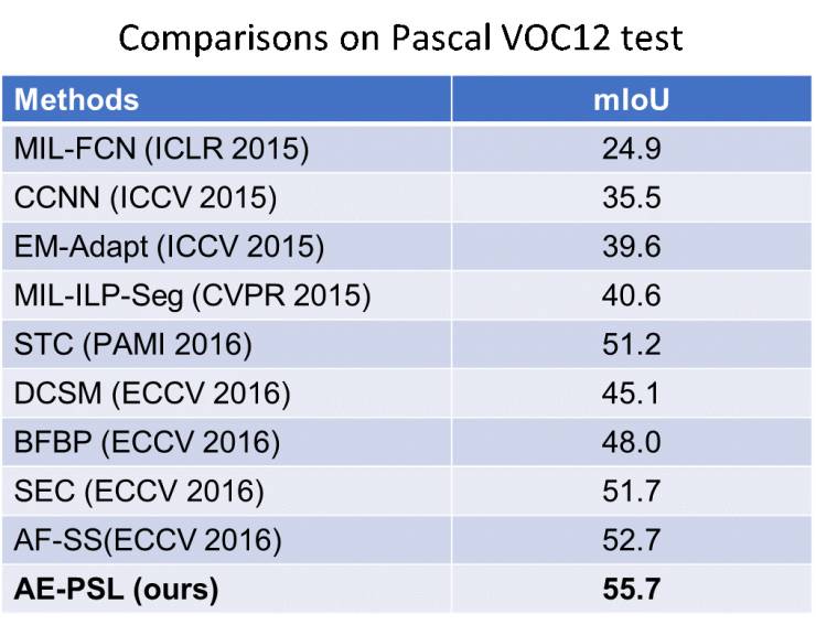 本文提出的对抗擦除和PSL方法,在Pascal VOC 2012数据集上获得了目前最好的分割结果。部分测试图片上也达到了令人满意的分割结果。