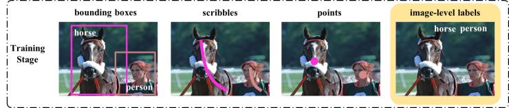 图像语义分割是计算机视觉领域的核心研究问题之一。一般来讲,训练高性能的语义分割模型需要依赖于大量的像素级的人工标注(即标注每个像素点的语义信息)。然而,标注这类的训练样本非常困难,往往需要大量的金钱和时间。为了降低获取训练样本的难度,研究人员提出采用一些相对容易获取的标注作为监督信息(我们称之为弱监督),并用于训练图像语义分割模型。目前这些弱监督信息主要包括了bounding boxes,scribbles,points和labels,如图1。