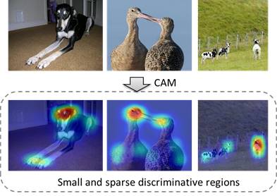 目前我们注意到研究人员们提出了一些自上而下的attention方法(CAM[1], EP[2]等)。这类方法可以利用训练好的分类CNN模型自动获得同图像标签最相关的区域。如图2所示,我们给出了通过CAM方法获取的attention map。可以看出对于一个图像分类模型,往往物体的某个区域或某个instance对分类结果的贡献较大。因此这类attention方法只能找到同标签对应的某个物体最具判别力的区域而不是物体的整个局域。如何利用分类网络定位物体的整个区域,对语义分割任务具有重要意义。