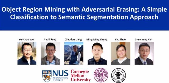 新加坡国立大学博士后魏云超博士、新加坡国立大学助理教授冯佳时博士、卡内基梅隆大学梁小丹博士、南开大学程明明教授、北京交通大学赵耀教授及360人工智能研究院院长颜水成博士所作论文「Object Region Mining with Adversarial Erasing: A Simple Classification to Semantic Segmentation Approach」被CVPR 2017录用为口头报告(oral,录用率2.65%)。论文一作魏云超博士撰写了关于这篇论文的独家解读文章,以飨读者。