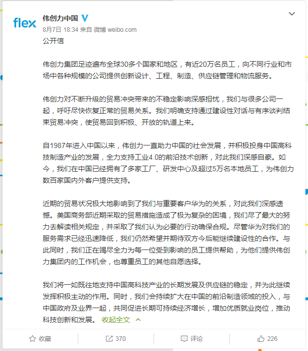 8月7日晚间,美资代工巨头伟创力发布一封公开信,回应其与华为之间的关系。