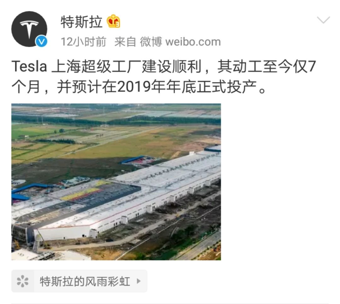 特斯拉:上海超级工厂建设顺利 预计在2019年年底正式投产