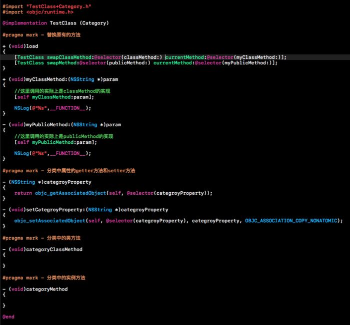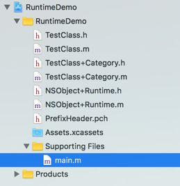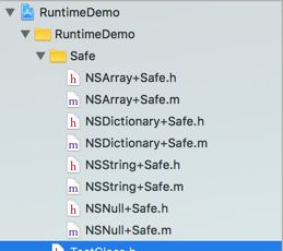 我们先创建一个测试Demo如下图,其中TestClass是一个测试类,TestClass+Category是它的一个分类,NSObject+Runtime封装了一些Runtime的方法。大家可以在这里下载Demo。