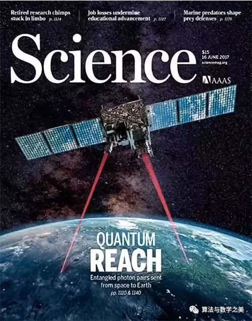 《科学》杂志封面上,“墨子号”从星空向地面发出两道光,宛如两条长腿跨出一大步,也象征量子通信向实用迈近一大步。(图片来自网络)