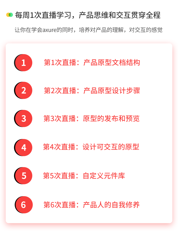 Axure实战班安排了6次直播课,老师会在直播课上讲解更多的交互和产品设计。让你在学Axure的同时,培养对产品的理解,对交互的感觉
