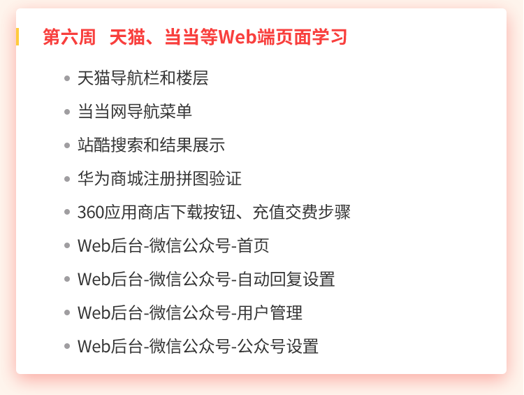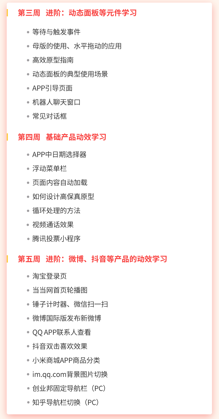 在前2周功能基础掌握的情况下,你会系统学习到web端、手机端的产品交互动效,进阶学习切换、拖动、平滑等15+个进阶效果