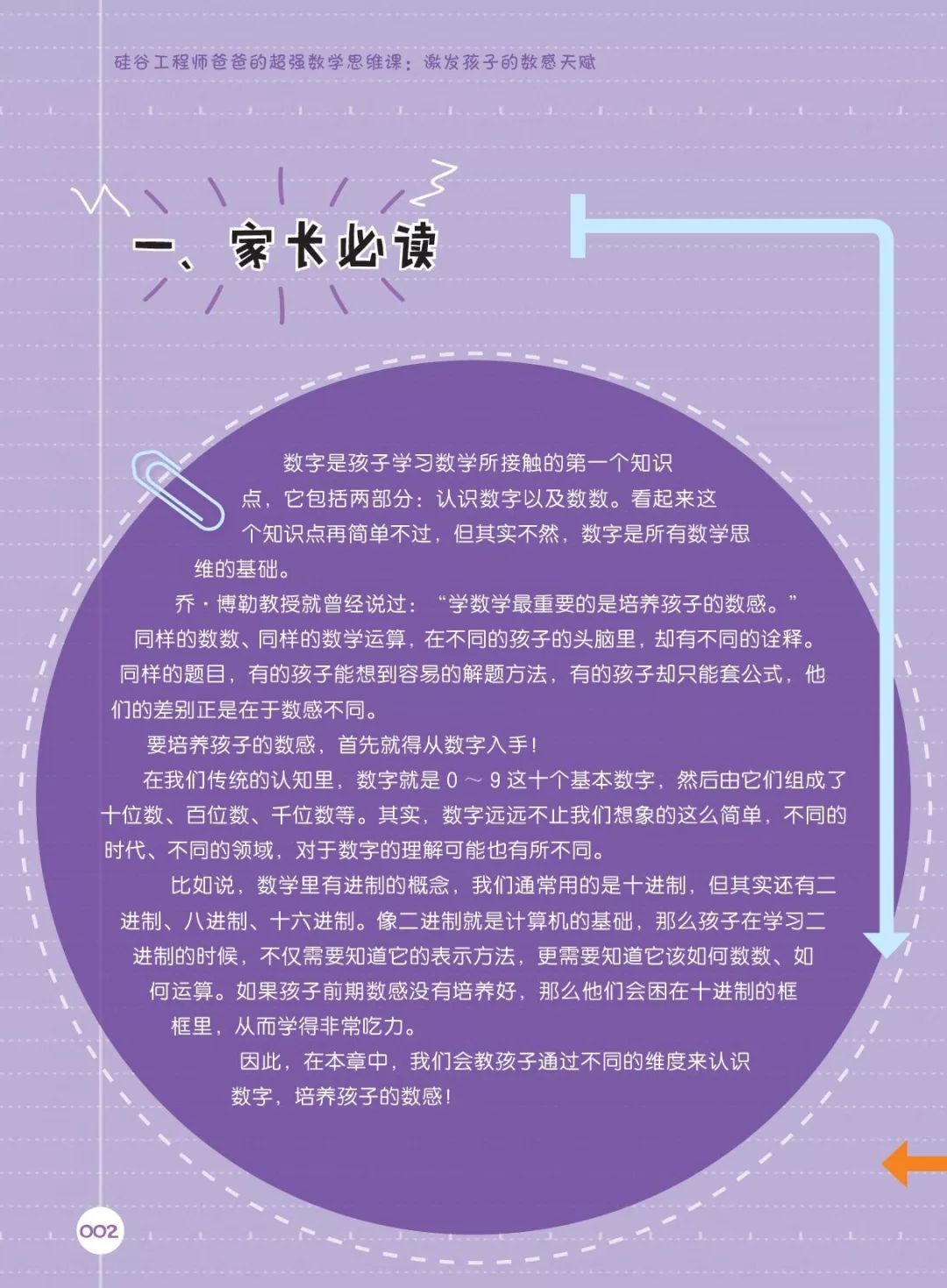 《硅谷工程师爸爸的超强数学思维课》一共两册,分为“数感篇”和“几何篇”,适合4~8岁的孩子和父母阅读。相信一定会对孩子的数学思维提高有莫大的帮助!