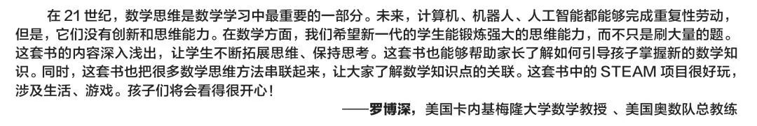 这套书写完后,憨爸还特地请卡内基梅隆大学数学系教授、美国奥数队总教练罗博深教授指点。因为罗教授是这方面的全球顶尖权威之一,他指点可以让这套书更完美。罗教授极少给人背书,却为这套书写了一段推荐语,足见他对这套书的认可。这更让我们相信,这套书能帮到大家。