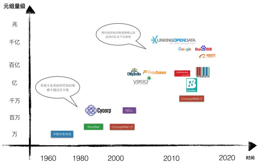 知识图谱与传统专家系统时代的知识工程有显著的不同。与传统专家系统时代主要依靠专家手工获取知识不同,现代知识图谱的显著特点是规模巨大,无法单一依靠人工和专家构建。传统的知识库,如由Douglas Lenat从1984年开始创建的常识知识库Cyc仅包含700万条 的事实描述(Assertion)。Wordnet主要依靠语言学专家定义名词、动词、形容词和副词之间的语义关系,目前包含大约20万条的语义关系。由著名人工智能专家Marvin Minsky于1999年起开始构建的ConceptNet[24]常识知识库依靠了互联网众包、专家创建和游戏三种方法,但早期ConceptNet规模在百万级别,最新的ConceptNet 5.0也仅包含2800万RDF三元组关系描述。现代知识图谱如谷歌和百度的知识图谱都已经包含超过千亿级别的三元组,阿里巴巴于2017年8月份发布的仅包含核心商品数据的知识图谱也已经达到百亿级别。DBpedia已经包含约30亿RDF三元组,多语种的大百科语义网络BabelNet包含19亿的RDF三元组[25],Yago3.0包含1.3亿元组,Wikidata已经包含4265万条数据条目,元组数目也已经达到数十亿级别。截止目前,开放链接数据项目Linked Open Data 统计了其中有效的2973个数据集,总计包含大约1494亿三元组。