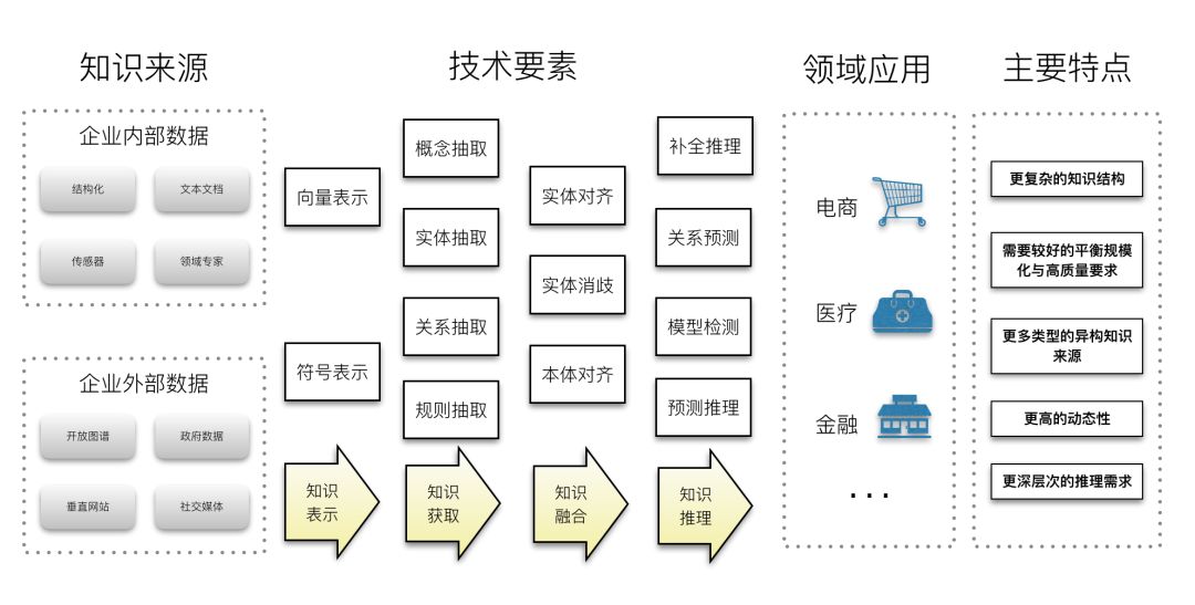 知识图谱的规模化构建需求对知识获取带来如下几个方面的变化:1)从单一人工获取到更多的依靠大数据和机器学习来实现自动化知识抽取;2)从单一来源变化为综合从结构化、半结构化、文本、传感器等多个来源,通过多任务相融合实现联合知识获取;3)从依靠少数专家到依靠互联网群体众包协同获取。