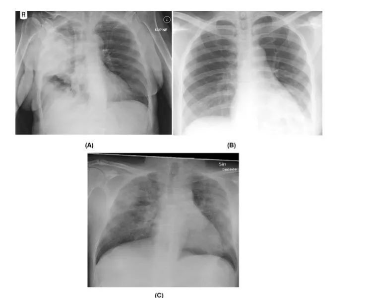 图1: 样本COVIDx数据集上的前后胸片图像:(a)细菌感染、(b)非COVID-19病毒感染和(c)COVID-19病毒感染。