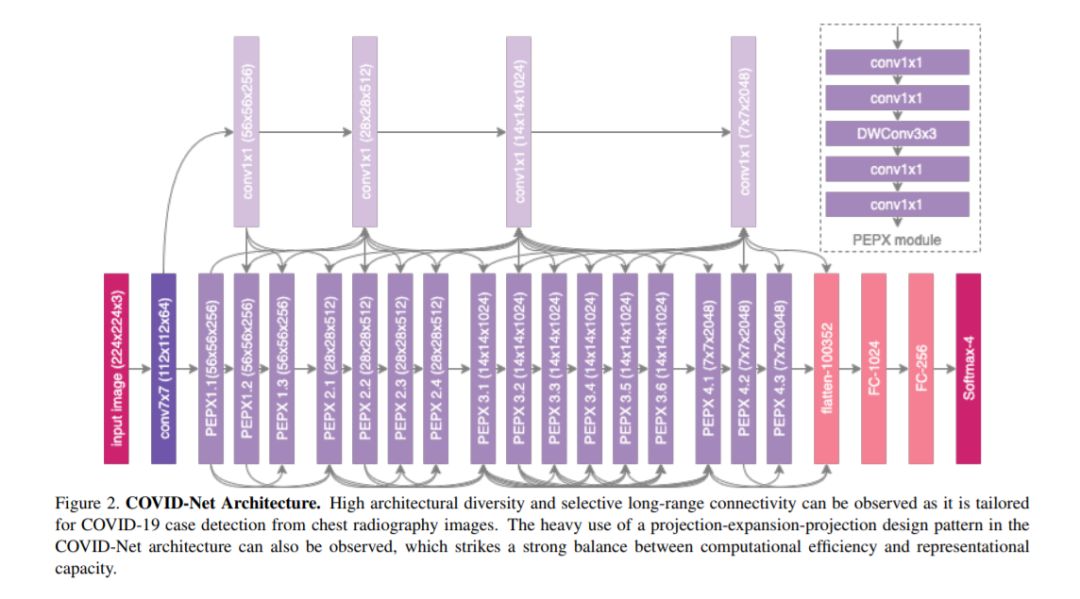 COVID-Net架构。可以观察到高度的架构多样性和选择性的远程连接,因为它是为covid19病例检测量身定制的胸片图像。在COVID-Net架构中大量使用了投影-扩展-投影的设计模式,这在计算效率和表示能力之间取得了很强的平衡。