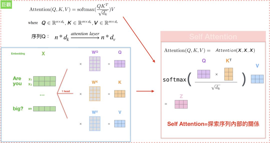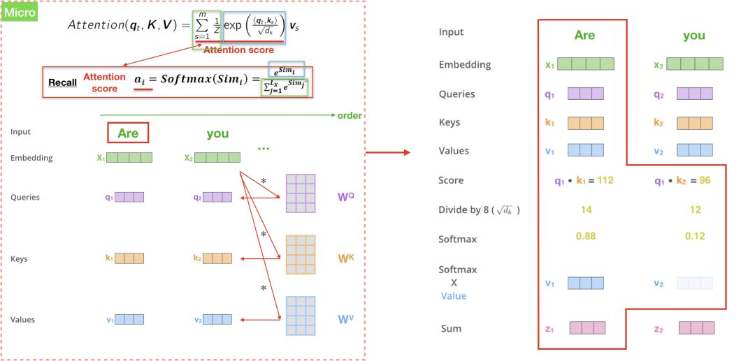 我们先用微观的角度来观察Attention(q_{t}, K, V),也就是输入句中的某个文字,再将所有输入句中的文字一次用矩阵Attention(Q,K,V)来解决。