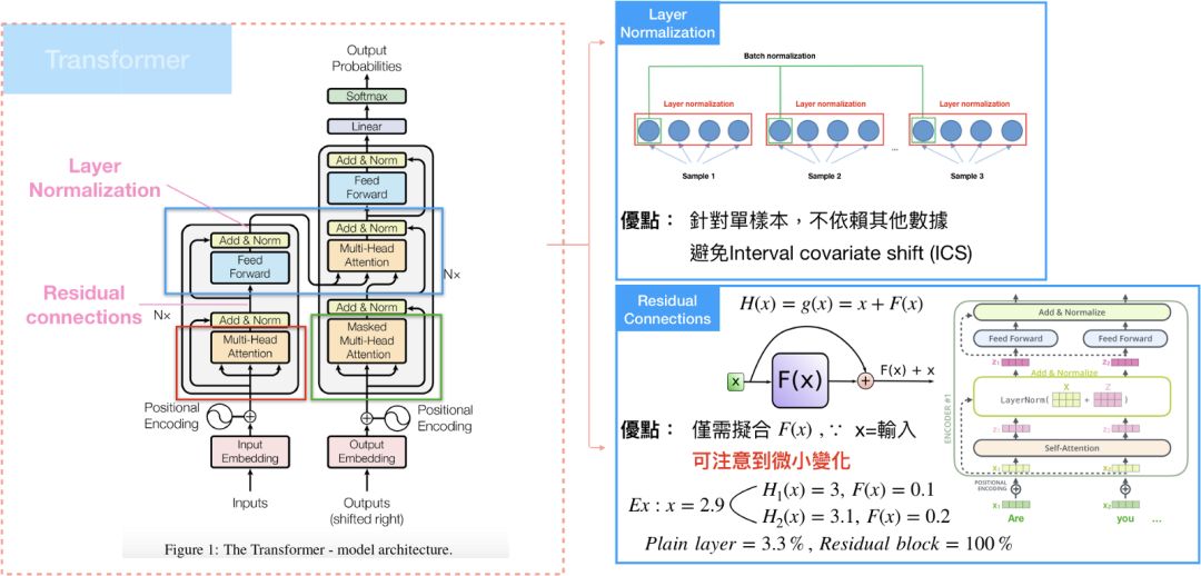 Residual connection 就是构建一种新的残差结构,将输出改写成和输入的残差,使得模型在训练时,微小的变化可以被注意到,这种架构很常用在电脑视觉(computer vision),有兴趣可以参考神人Kaiming He的Deep Residual Learning for Image Recognition。