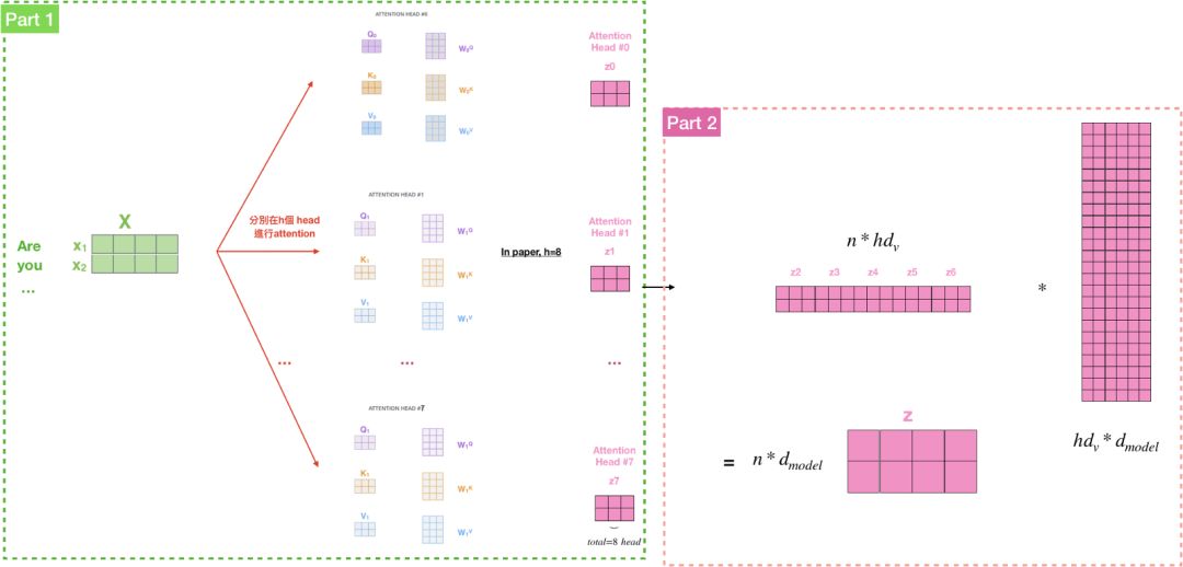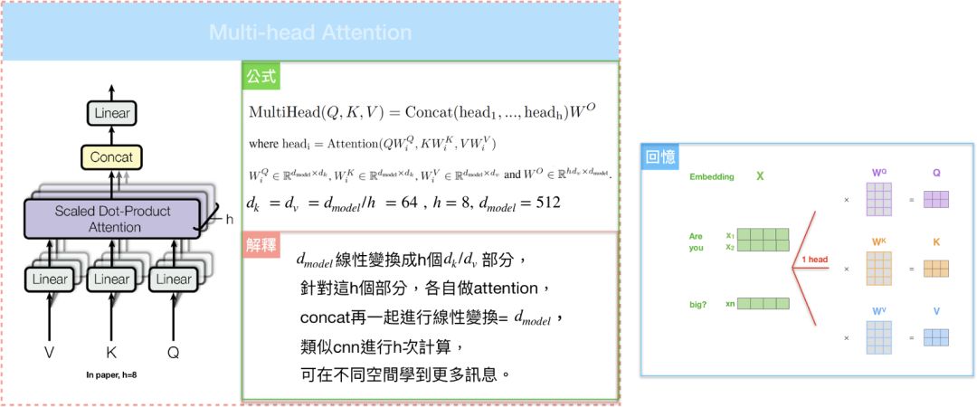 有趣的是,如果我们只计算一个attention,很难捕捉输入句中所有空间的讯息,为了优化模型,论文当中提出了一个新颖的做法:Multi-head attention,概念是不要只用d_{model}维度的key, value, query们做单一个attention,而是把key, value, query们线性投射到不同空间h次,分别变成维度d_{q}, d_{k} and d_{v},再各自做attention,其中,d_{k}=d_{v}=d_{model}/h=64,概念就是投射到h个head上。