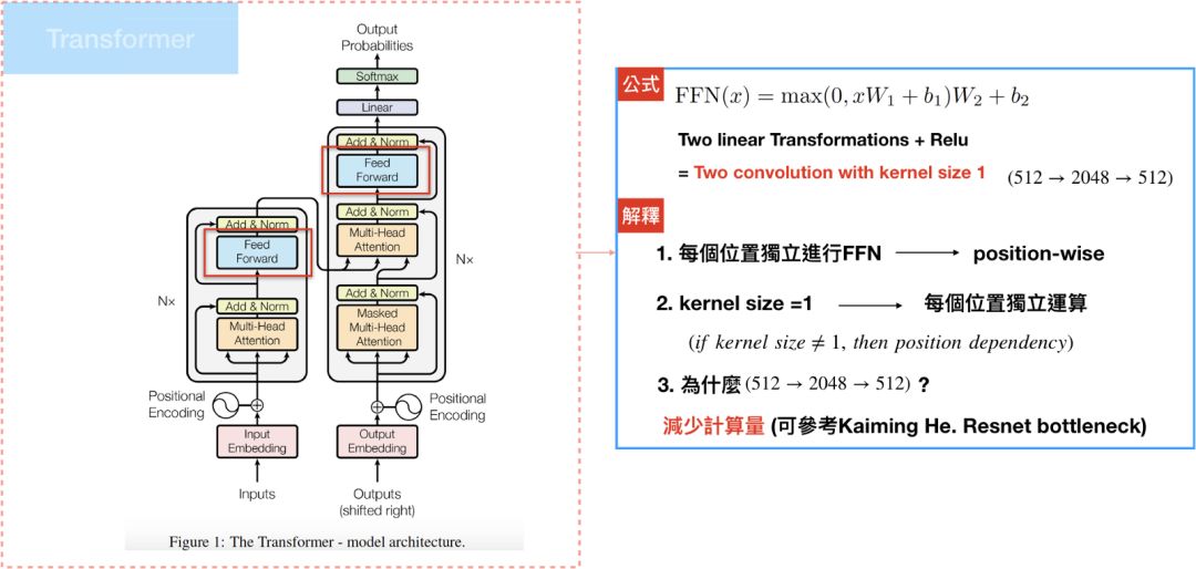 其中,每个位置进行相同的线性转换,这边使用的是convolution1D,也就是kernel size=1,原因是convolution1D才能保持位置的完整性,可参考CNN,模型的输入/输出维度d_{model}=512,但中间层的维度是2048,目的是为了减少计算量,这部分一样参考神人Kaiming He的Deep Residual Learning for Image Recognition。