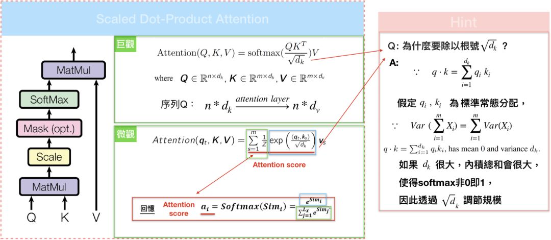 输入句中的每个文字是由一系列成对的 <地址Key, 元素Value>所构成,而目标中的每个文字是Query,那麼就可以用Key, Value, Query去重新解释如何计算context vector,透过计算Query和各个Key的相似性,得到每个Key对应Value的权重係数,权重係数代表讯息的重要性,亦即attention score;Value则是对应的讯息,再对Value进行加权求和,得到最终的Attention/context vector。