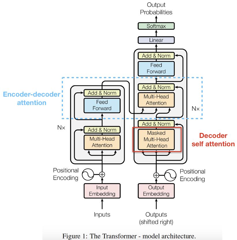不同的地方是,为了避免在解码的时后,还在翻译前半段时,就突然翻译到后半段的句子,会在计算self-attention时的softmax前先mask掉未来的位置(设定成-∞)。这个步骤确保在预测位置i的时候只能根据i之前位置的输出,其实这个是因应Encoder-Decoder attention 的特性而做的配套措施,因为Encoder-Decoder attention可以看到encoder的整个句子,