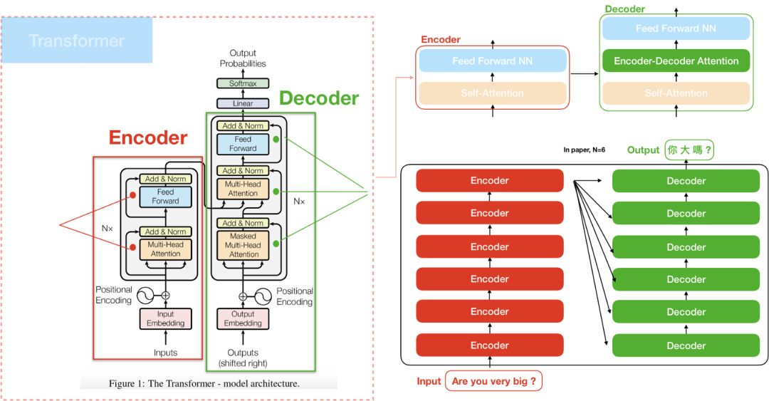 我们将”The transformer”模型分为左右两部分,左边是Encoder,如前述,”Attention is all you need”当中N=6,代表Encoder部分是由6个encoder堆积而成的。其中在计算encoder self attention时,更透过multi-head的方式去学习不同空间的特徵,在后续内容会探讨multi-head的部分。