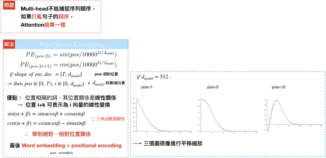 论文使用了方程式PE(pos, 2i)=sin(pos/10000^{2i/d_{model}})、PE(pos, 2i+1)=cos(pos/10000^{2i/d_{model}})来计算positional encoding,pos代表的是位置,i代表的是维度,偶数位置的文字会透过sin函数进行转换,奇数位置的文字则透过cos函数进行转换,藉由三角函数,可以发现positional encoding 是个有週期性的波长;举例来说,[pos+k]可以写成PE[pos]的线性转换,使得模型可以学到不同位置文字间的相对位置。