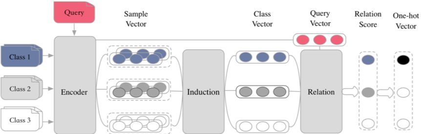 我们团队基于目前 Metric Based 方法,提出了 Encoder-Induction-Relation 的三级框架,如图 10 所示,Encoder 模块用于获取每个样本的语义表示,可以使用典型的 CNN、LSTM、Transformer 等结构,Induction 模块用于从支撑集的样本语义中归纳出类别特征,Relation 模块用于度量 query 和类别之间的语义关系,进而完成分类。