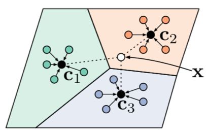 如图 6 所示,c1、c2、c3 分别是三个类别的均值中心(称 Prototype),将测试样本 x 进行 embedding 后,与这 3 个中心进行距离计算,从而获得 x 的类别。
