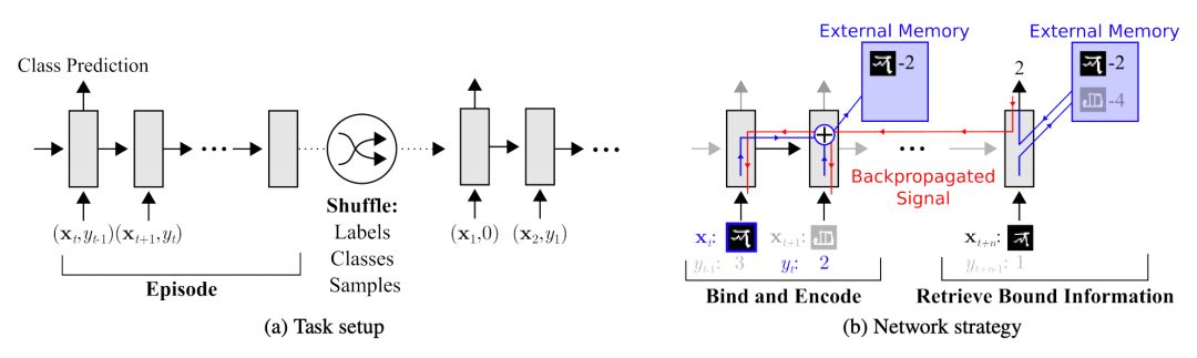 具体地,在 t 时刻,模型输入,也就是在当前时刻预测输入样本的类别,并在下一时刻给出真实的 label,并且添加了 external memory 存储上一次的 x 输入,这使得下一次输入后进行反向传播时,可以让 y (label) 和 x 建立联系,使得之后的 x 能够通过外部记忆获取相关图像进行比对来实现更好的预测。