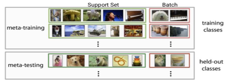 形式化来说,few-shot 的训练集中包含了很多的类别,每个类别中有多个样本。在训练阶段,会在训练集中随机抽取 C 个类别,每个类别 K 个样本(总共 CK 个数据),构建一个 meta-task,作为模型的支撑集(support set)输入;再从这 C 个类中剩余的数据中抽取一批(batch)样本作为模型的预测对象(batch set)。即要求模型从 C*K 个数据中学会如何区分这 C 个类别,这样的任务被称为 C-way K-shot 问题。