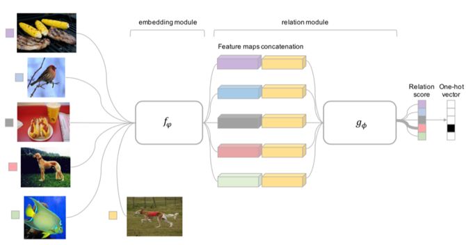 而 Relation Network [6] 认为度量方式也是网络中非常重要的一环,需要对其进行建模,所以该网络不满足单一且固定的距离度量方式,而是训练一个网络来学习(例如 CNN)距离的度量方式,在 loss 方面也有所改变,考虑到 relation network 更多的关注 relation score,更像一种回归,而非 0/1 分类,所以使用了 MSE 取代了 cross-entropy。