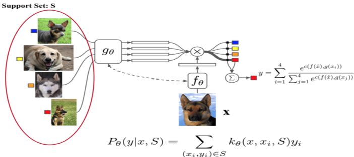 相比孪生网络,匹配网络(Match Network)[2] 为支撑集和 Batch 集构建不同的编码器,最终分类器的输出是支撑集样本和 query 之间预测值的加权求和。