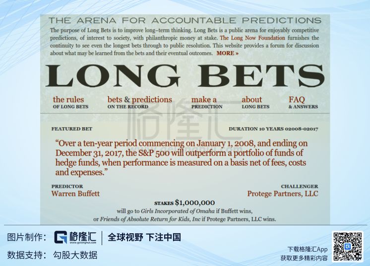 一个残酷的事实是,大多数对冲基金的收益率都是跑不赢指数的。为了证明这一点,2007年12月19日,巴菲特在LongBets网站上发布“十年赌约”,以50万美金为赌注,如果谁有信心建立一个对冲基金的组合,在2008年1月1日~2017年12月31日的十年间,跑赢标普500指数,谁就能拿走赌池中的100万美金。