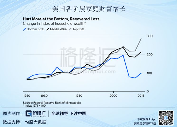 2008年金融危机之前,美国三个阶层(头10%高收入人群,中间40%中等收入人群与底层50%中低收入人群)的家庭财富积累速率基本是齐头并进的。2008年次贷危机发生,对低收入人群的影响要显著高于另外两个人群,因为房产是低收入人群的主要资产,在下跌的房价中,很多人因为还不起房贷而不得不将房产甩卖,导致个人资产缩水严重。