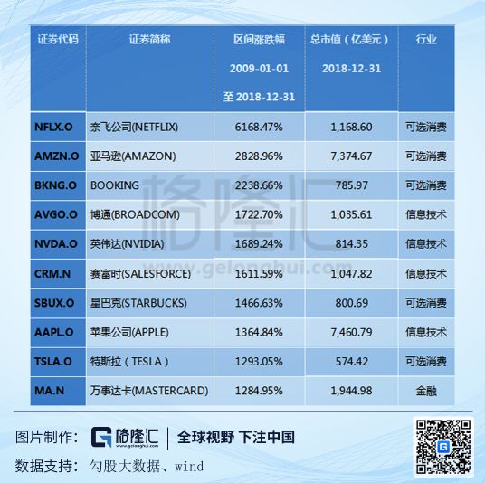 我们选取2009-2018年这十年为时间区间,截止日市值大于500亿美元为市值区间,因为我们的目的不仅是为了找到涨幅最高的公司,还想要找到优质的公司,正是它们拥有改变世界的力量。
