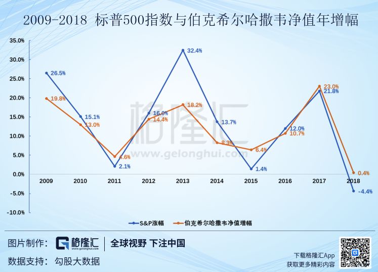 实际上,连巴菲特自己也不得不成为2009-2018年这十年牛市的一个注脚。回过头看伯克希尔哈撒韦在这十年中的净值增长,也仅仅有2011、2015、2017、2018这四年跑赢了大盘。总的来说,巴菲特在这十年的年化收益率大约为11.7%,而同期标普500指数的年化收益则来到了13.1%。