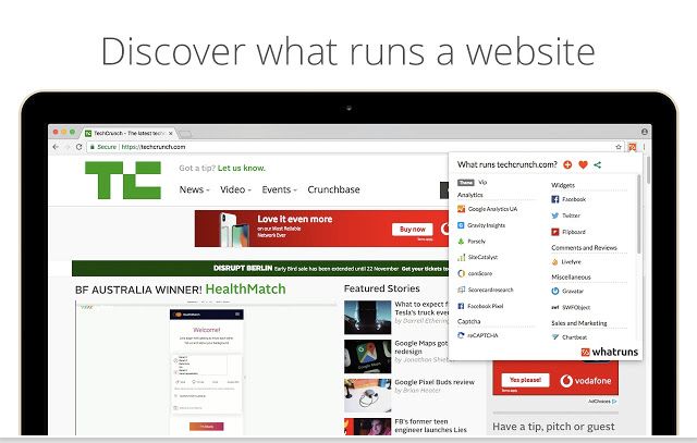 在安装了这款插件后,使用者可以通过点击 WhatRuns 图标来打开插件窗口,通过该窗口使用者可以轻松了解网站的技术信息。