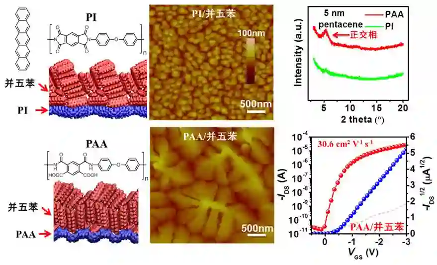 图3 并五苯在 PI 和 PAA 表面的生长方式、薄膜形貌、结晶性以及电学性质