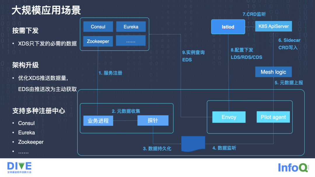 我们还对接了很多注册中心,包括 Consul、Eureka、Zookeeper,存量业务可能使用了多种注册中心,在向服务网格去迁移的时候,我们需要对接这些注册中心。