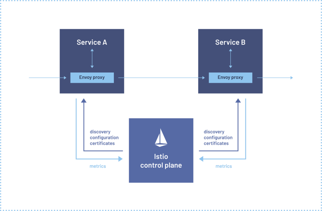 Service A 和 Service B 是我们的两个业务应用,Envoy Proxy 就是一个透明代理,它本身对业务是透明的。我们可以看到,有一个控制平面 Istio control plane,控制平面可以简单理解为,它会向着我们所有的 sidecar 去推送整体的一些配置、数据等等。通过这样一个典型的 Istio 架构,来引出我们这个服务网格的概念。