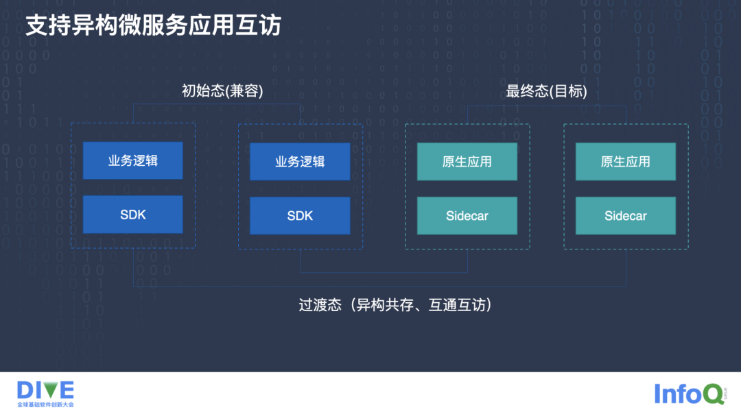 我们在探寻的时候发现,传统的业务逻辑加 SDK 的微服务架构,和应用加 sidecar 这样一个全新的 Service Mesh 架构,是有一个过渡态的。在这个过渡态里,我们需要异构应用的互访,也就是说,传统的微服务应用能够和我们这个 Service Mesh 的应用去做互通,Service Mesh 里面的应用程序,同样要去和这种传统的异构程序去互通,我们称它为过渡态。这是我们典型的一个应用场景,也是业务线比较关心的一个问题。